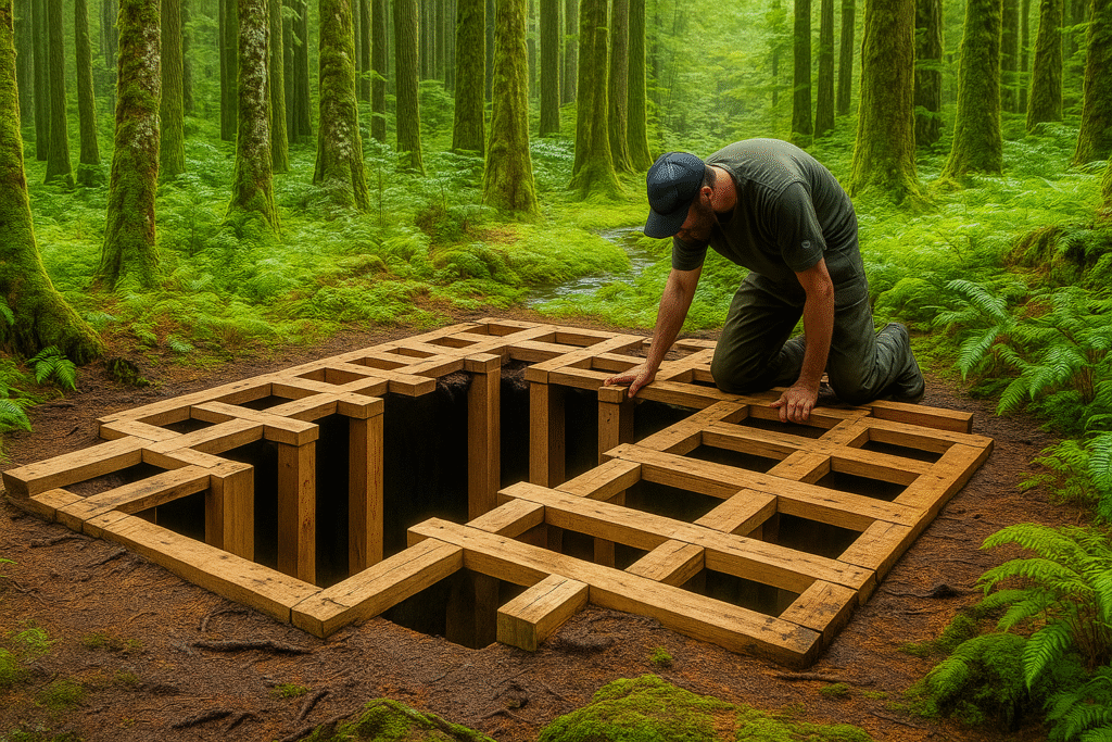 In a quiet forest, a man began a project to build a secret underground cabin.